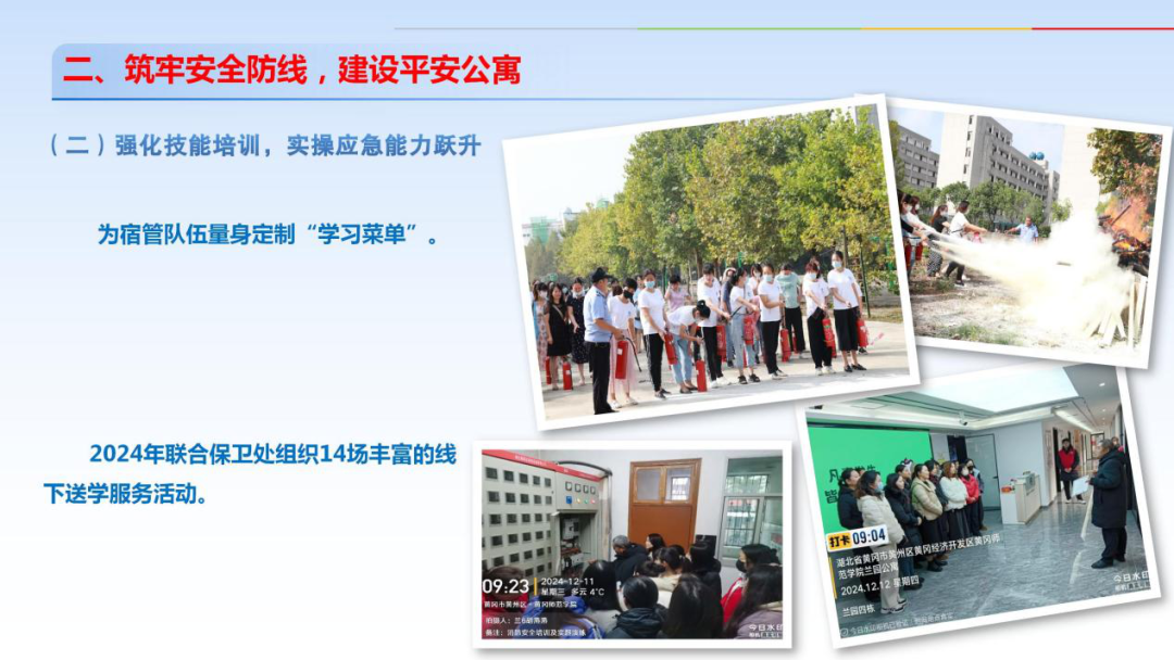 组织9场消防灭火实操演练、心肺复苏、心理知识培训、流行感冒知识讲座、保密教育线上培训等活动,全面提升宿管员的整体业务素质。定期开展“夜间火情模拟演练”,提升应急响应速度。