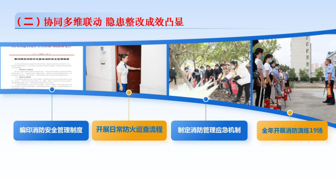 实行动态管理,落实“台账通报问效”制度,每周对各学院安全检查、违纪违规、晚归未归等数据亮屏,全程跟踪式推动工作落实,2024年累计发现并整改安全隐患2300余条,学生违规行为同比下降65%。