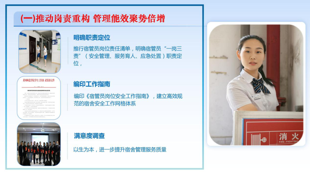 推行宿管员岗位责任清单,明确宿管员“一岗三责”(安全管理、服务育人、应急处置)职责定位,编印《宿管员岗位安全工作指南》,开展宿管员服务质量满意度问卷调查,不断提高管理水平与服务质量。
