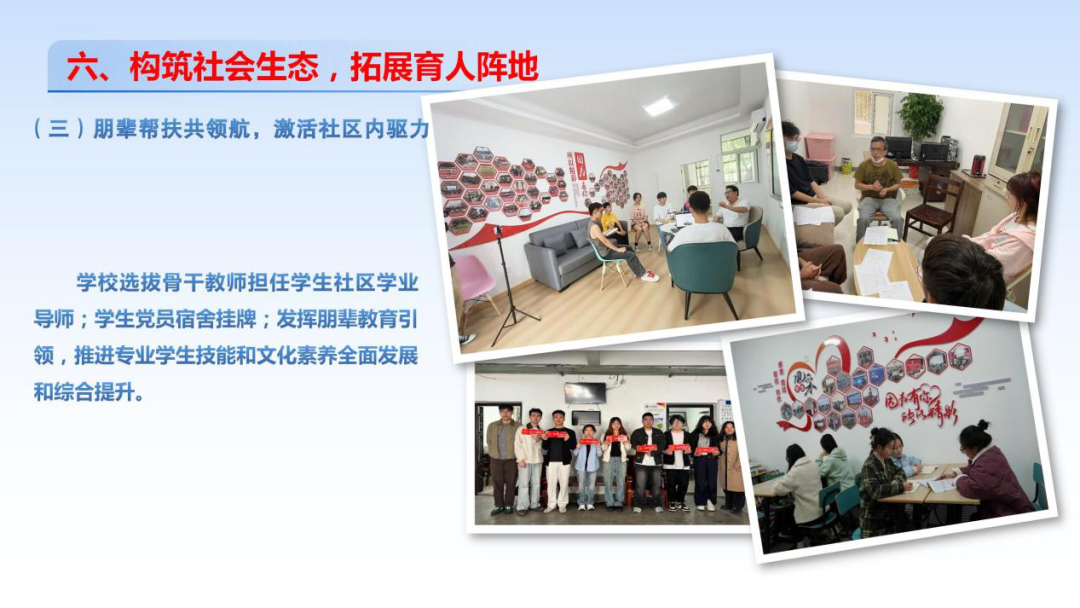 学校选拔骨干教师担任学生社区学业导师,指导学生学业发展、科研训练;班主任进宿舍指导学生习惯养成、人际关系等;学生党员宿舍挂牌,密切联系楼层宿舍、发挥朋辈教育引领,推进专业学生技能和文化素养全面发展和综合提升。学生社区自投入使用以来,累计举办系列学术交流、朋辈帮扶引领活动76场,举办社会实践分享活动22场、学生社团活动38场、党建活动16场。