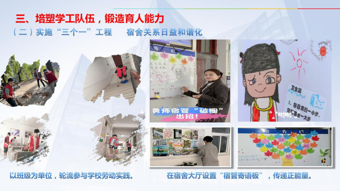 我校通过实施“三个一”工程,使宿管员全面融入学生生活:一是每日一句暖心问候:在宿舍大厅设置“宿管寄语板”,传递正能量;二是每周一次劳动值周:以班级为单位,轮流参与学校劳动实践,负责宿舍环境卫生、绿化保洁等,提高自我管理与团队合作能力;三是每学期一场文化节:宿管员与学生共同策划“宿舍文化月”“趣味运动会”,增强归属感。