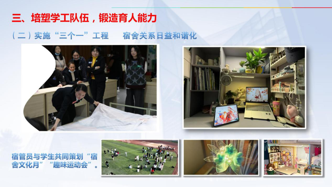 坚持协同三联动:与保卫处联动整治消防隐患,与后勤保障处联动优化设施服务,与心理咨询中心联动开展“宿舍心理角”活动。