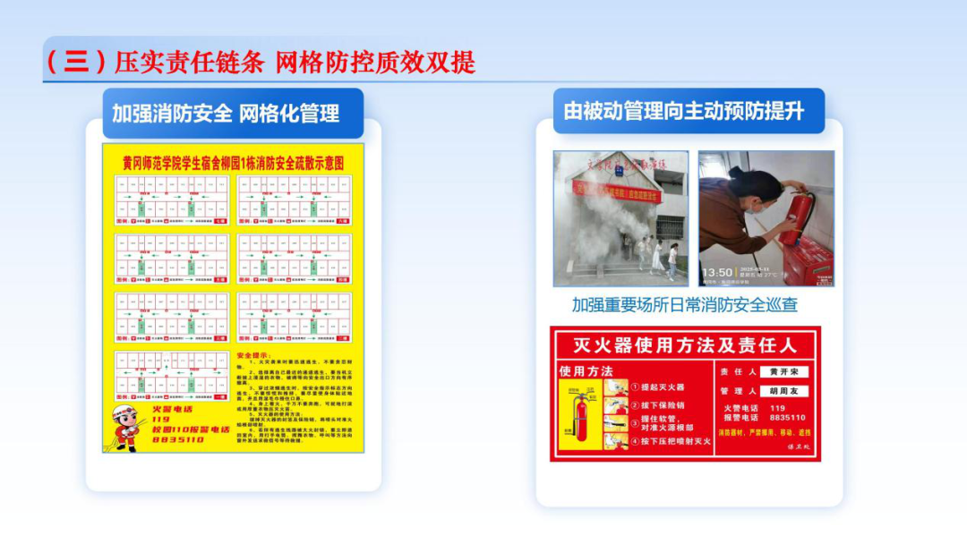一方面加强学生公寓网格化管理,实现学生公寓消防应急疏散逃生示意图全域覆盖,明确宿舍安全和设施设备安全使用的第一责任人,每栋公寓公示消防责任人信息,明确宿舍安全监管、设施维护、隐患整改、应急演练四大职责。另一方面,持续推动消防管理从被动应急向主动预防跃升。如,在3月26日的日常巡查中,一名消防责任人及时发现宿舍门前电动车自燃引发火情,因处置迅速,成功避免了一场火灾事故,成为制度实效的生动体现。