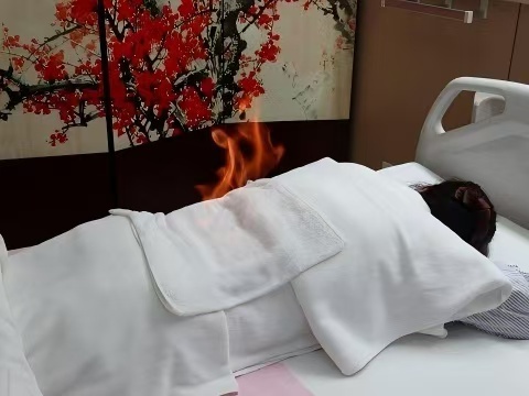 将中药饼敷于治疗部位,在毛巾上洒酒精并点火,促使患者排汗以缓解寒证——这一源于灸法的中医适宜技术火灸,历史悠久。