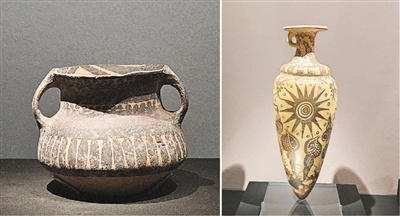 彩陶在中国和希腊拥有彼此独立的文化基础,呈现出既有共性又具差异性的艺术风貌。马家窑彩陶的黑红彩宽带纹样,与米诺斯彩陶的自然主义图案相呼应,二者分别折射出农耕文明与海洋文明对自然景观的抽象表达与直观描绘。左图为“代达罗斯:希腊克里特岛的神话”特展展出的彩陶线条纹双系罐,右图为海洋风格纹卵形陶来通杯。