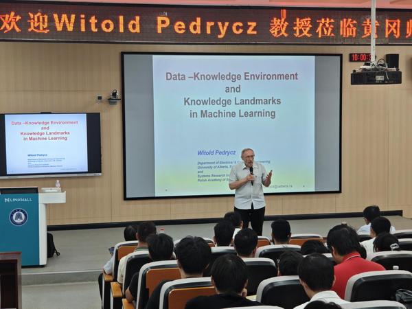 Witold Pedrycz院士作了题为《Data – Knowledge Environment and Knowledge Landmarks in Machine Learning》的学术报告,介绍了机器学习中数据与知识融合的关键问题,提出了KD-ML(Knowledge-Driven Machine Learning)这一创新范式,展示了如何利用科学知识和常识性规则增强模型的鲁棒性和可解释性,并特别强调了信息粒化在解决数据与知识冲突中的重要作用。报告会现场,Witold Pedrycz院士还就机器学习、人工智能技术的应用等热点问题与师生们展开了深入交流。