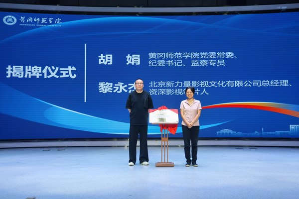 胡娟与当选会长、广电2001级校友、北京新力量影视文化有限公司总经理、资深影视制片人黎永杰为黄冈师范学院校友会传媒与影视学院校友会校友分会揭牌。