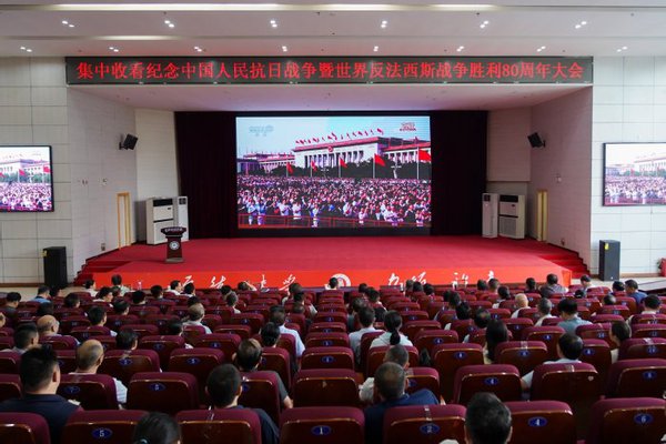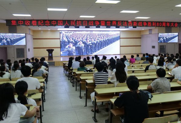 本网讯 9月3日上午9时,纪念中国人民抗日战争暨世界反法西斯战争胜利80周年大会在北京天安门广场隆重举行。中共中央总书记、国家主席、中央军委主席习近平发表重要讲话并检阅部队。我校组织全校师生收看了纪念大会实况直播。